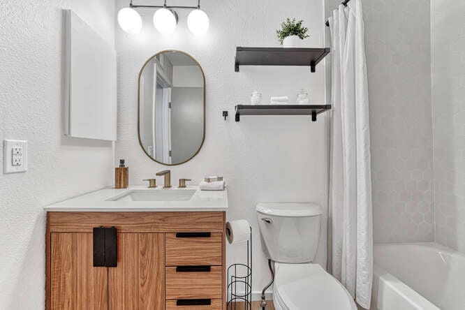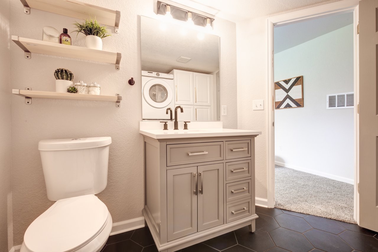 Upstairs, the bathroom received a full refresh with a new tub, vanity, tile, and lighting. In the basement bathroom, we stacked the new washer and dryer to make room for full-height storage cabinets, then updated the space with a new vanity and modern tile.