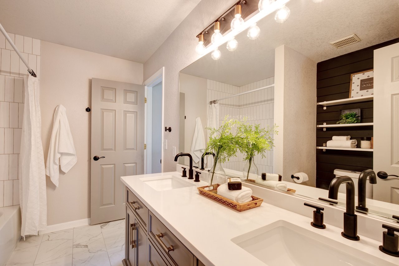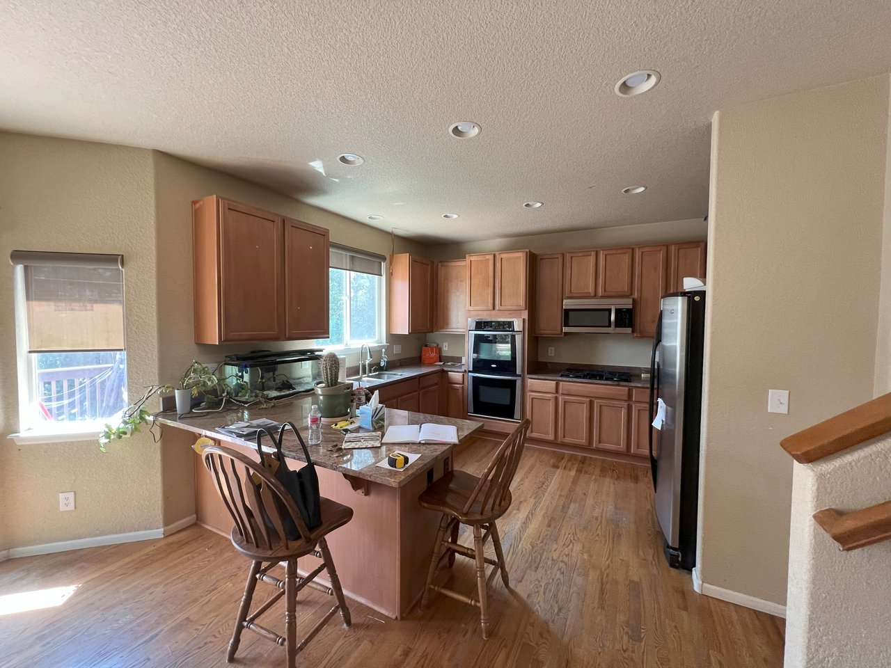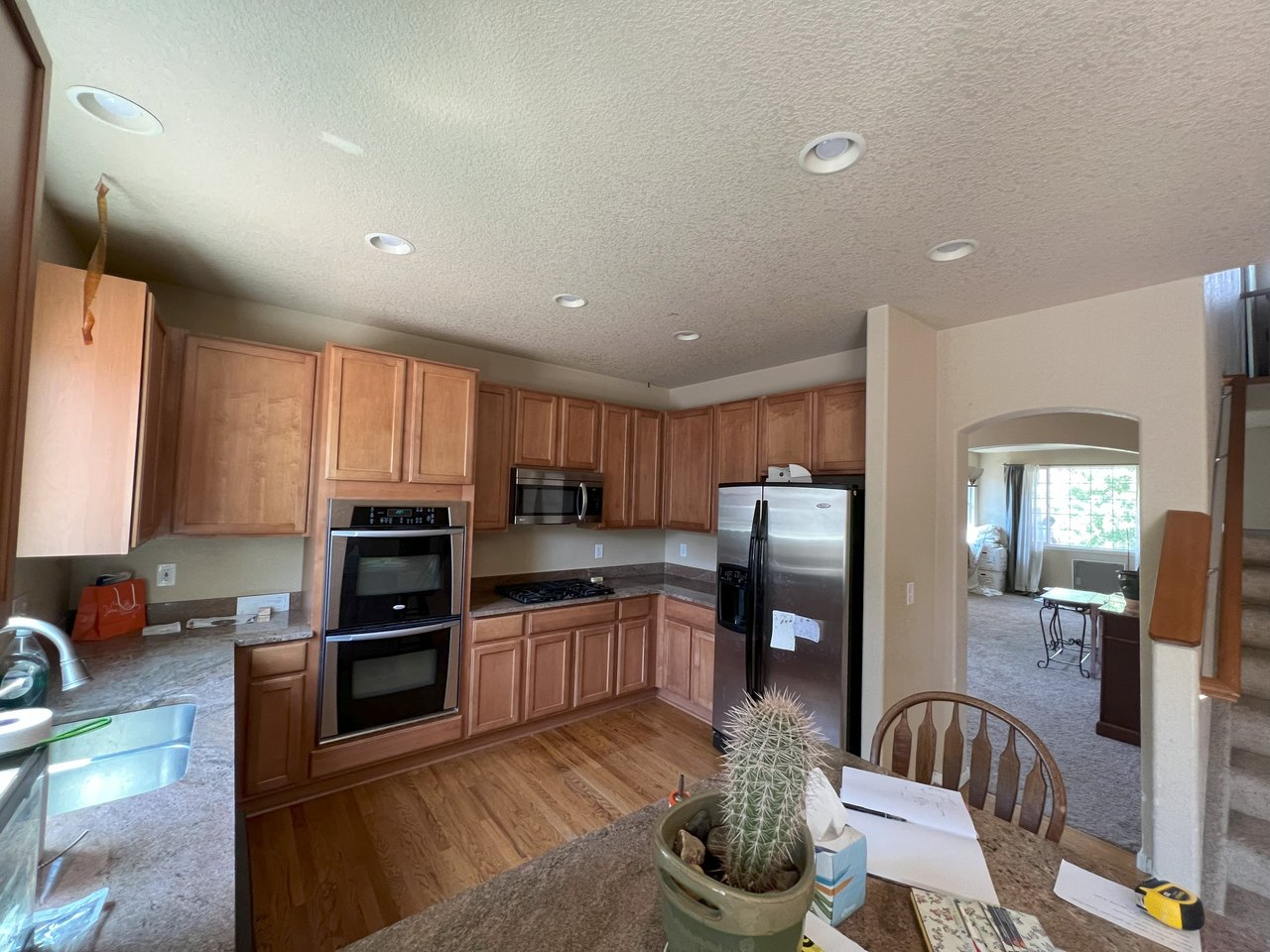 We repaired extensive drywall and millwork damage left by the puppy, then updated all bathrooms with fresh finishes and replaced worn flooring throughout. In the kitchen, we painted the cabinets, added new countertops and a stylish backsplash, and replaced dated lighting. We also removed the two-level peninsula and replaced it with a smooth, flat surface creating an open, modern workspace ideal for entertaining.