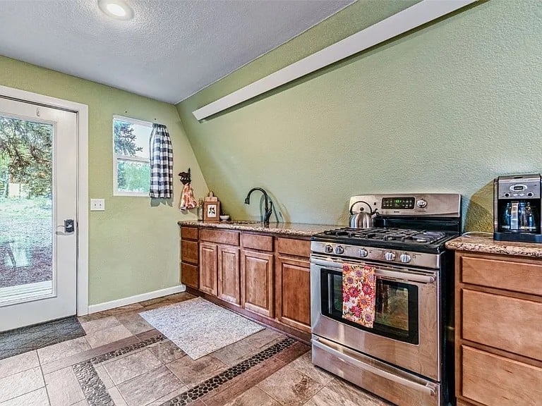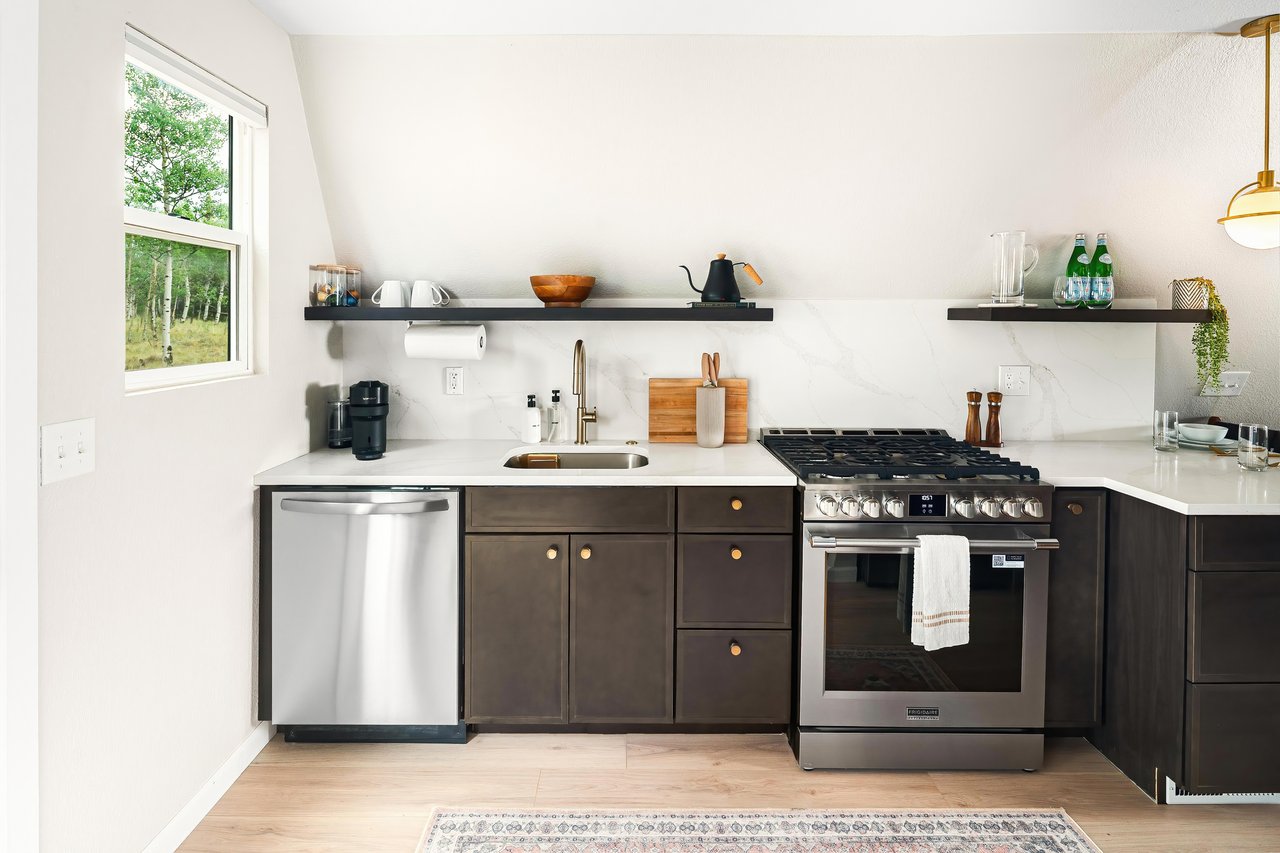We replaced the home’s wood-burning fireplace and outdated systems with a gas fireplace on a timer, a forced-air heating system, and a space-saving tankless water heater. All of this bringing reliability, efficiency, and guest-friendly simplicity. The remote location meant the kitchen needed to be fully functional, so we installed a gourmet gas stove, full-size refrigerator, dishwasher, and durable quartz countertops with a matching backsplash.