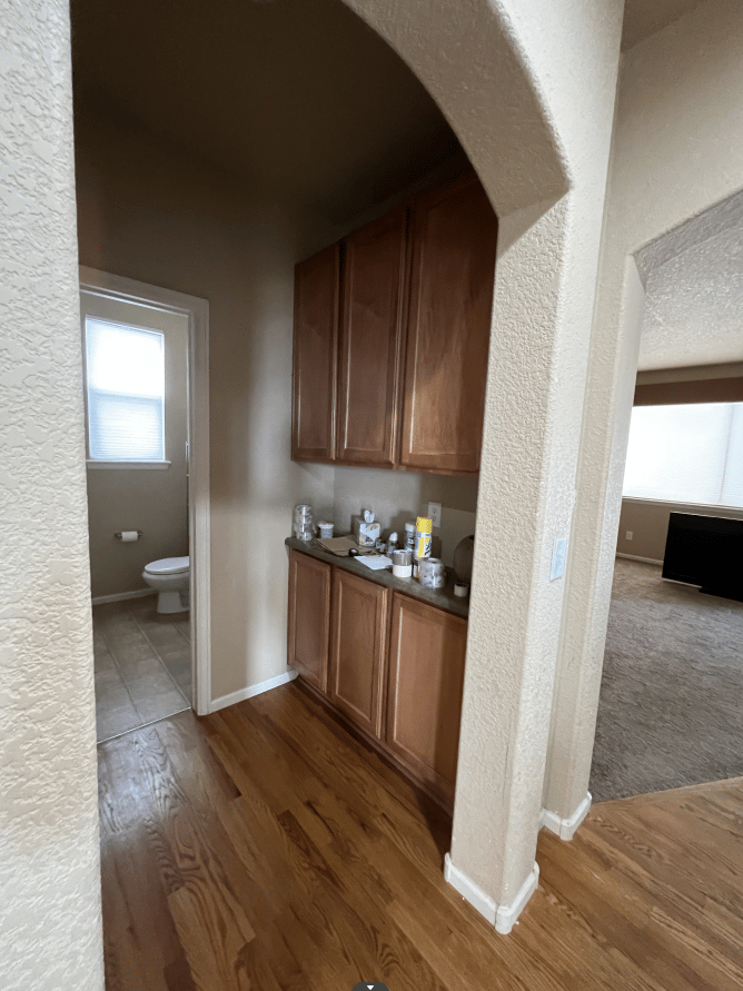 This 1980s builder-basic home had great bones and an open-concept layout, it simply needed thoughtful cosmetic updates and smarter storage solutions. The front living area, a large airy room filled with potential (but overwhelmed by orange-toned woodwork across the trim, cabinetry, and flooring), was what initially drew us to the project.